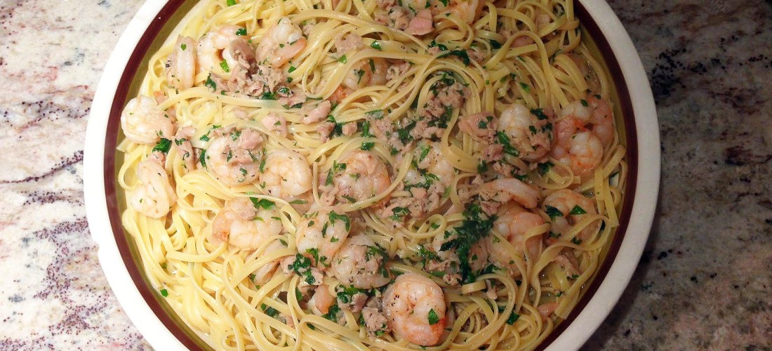- In a large pot of boiling water with 1 tbsp salt, cook linguine until al dente. Drain linguine and place in a large serving bowl. Add shrimp to clam mixture and pour over hot linguine. Toss to coat and top with chopped parsley.